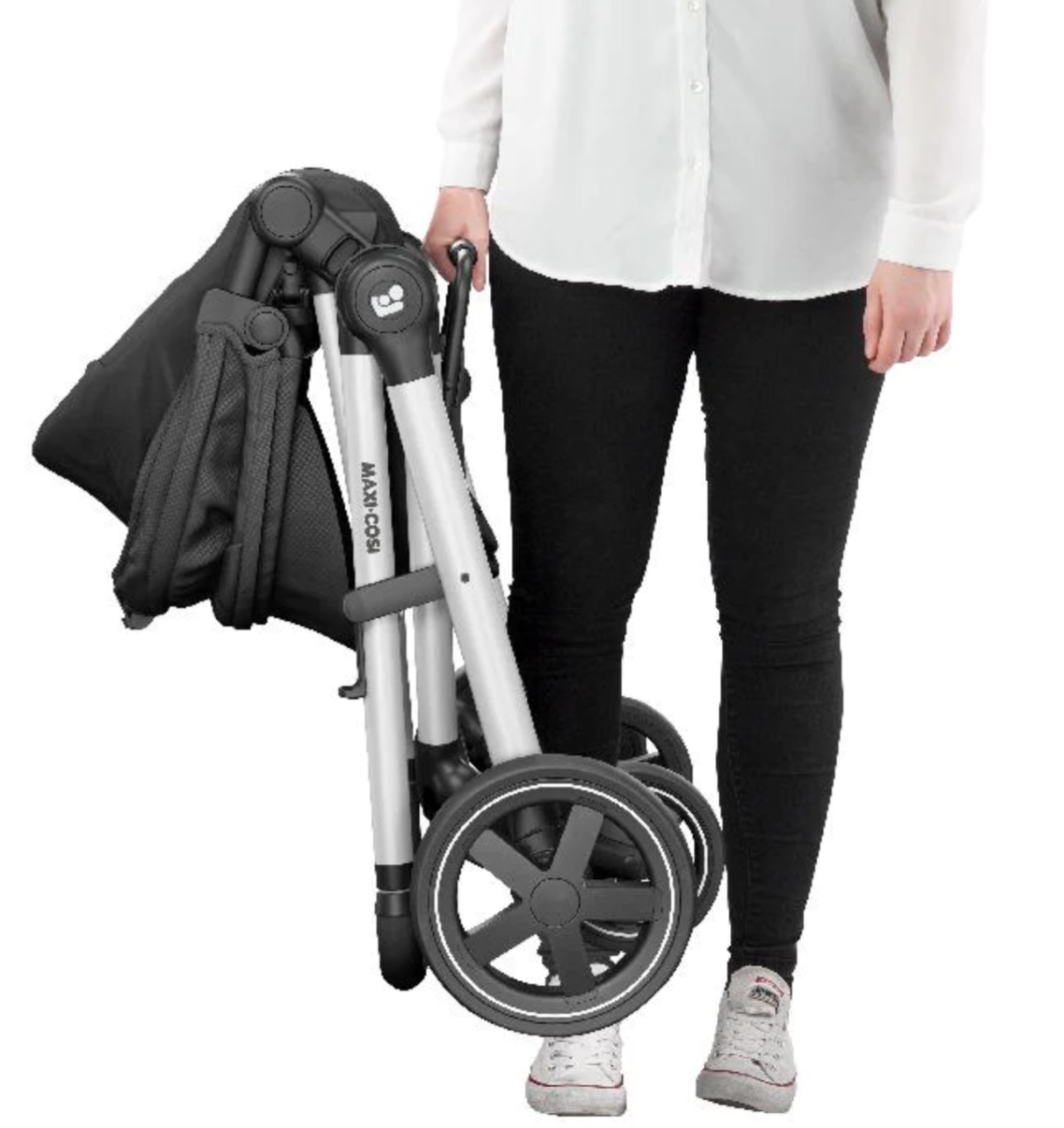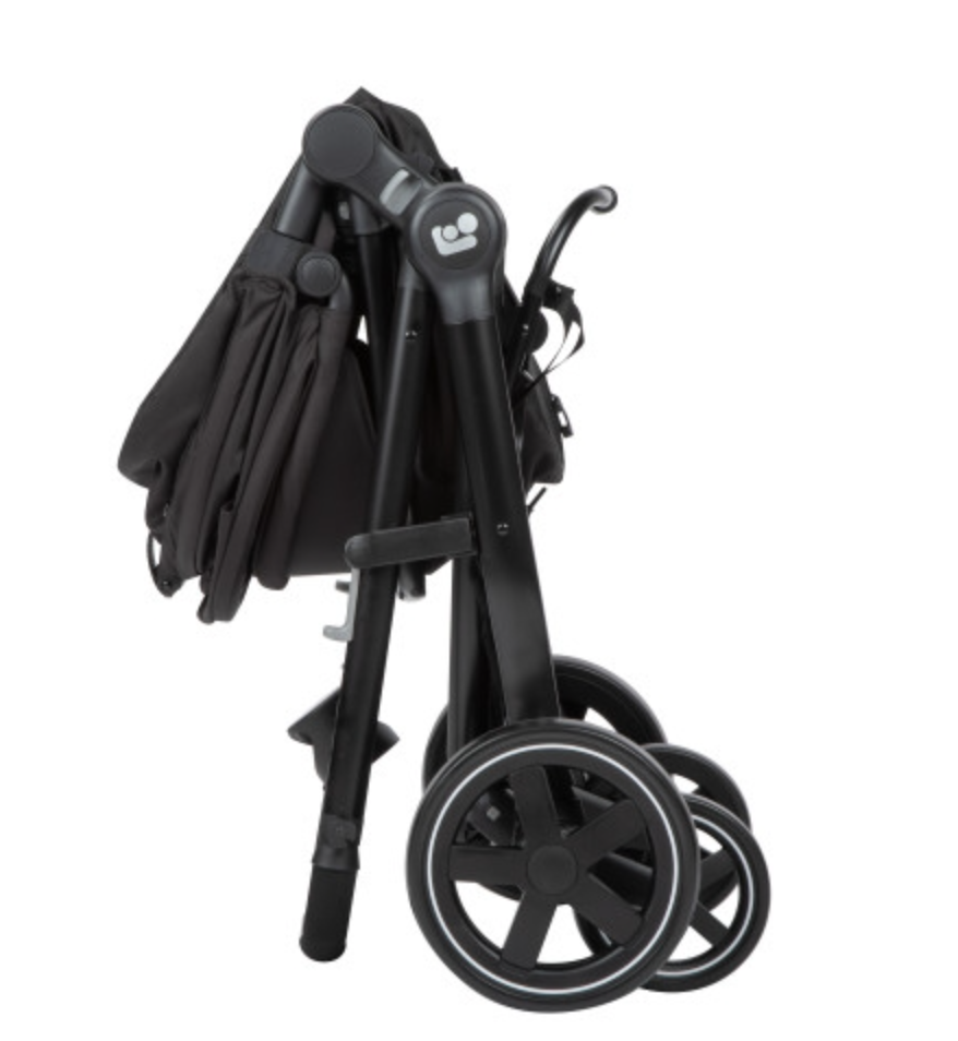 - Stroller folds without bending, and stands upright when folded